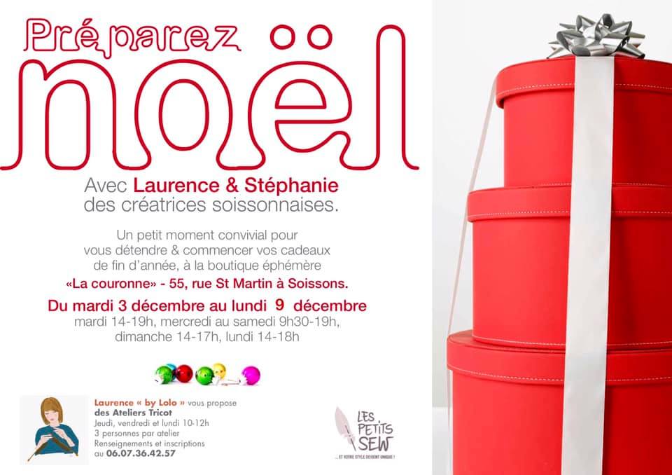 Retrouvez Laurence By Lolo et Stéphanie Les Petits Sew , dès demain après-midi, pour Préparer vos cadeaux de Noël à la Boutique Éphémère « La Couronne », 55, rue Saint Martin à Soissons !