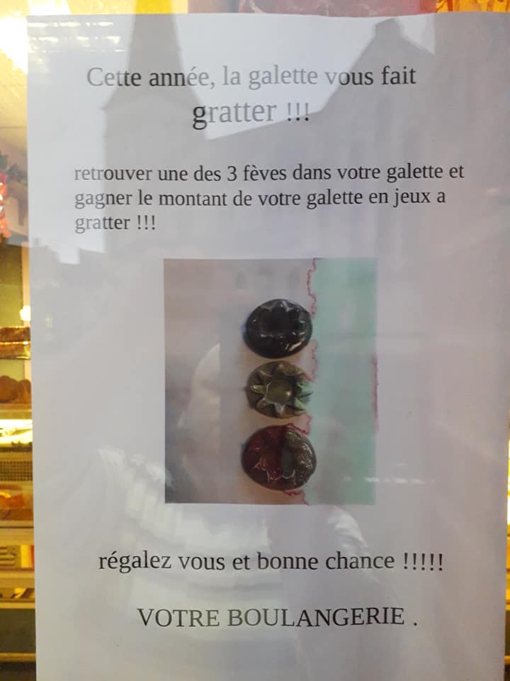 Chacune de ces 3 fèves vous fait gagner une pochette de jeux à gratter d'une valeur égale au prix de la galette avec notre partenaire " Bar Pmu Le Trotteur" .