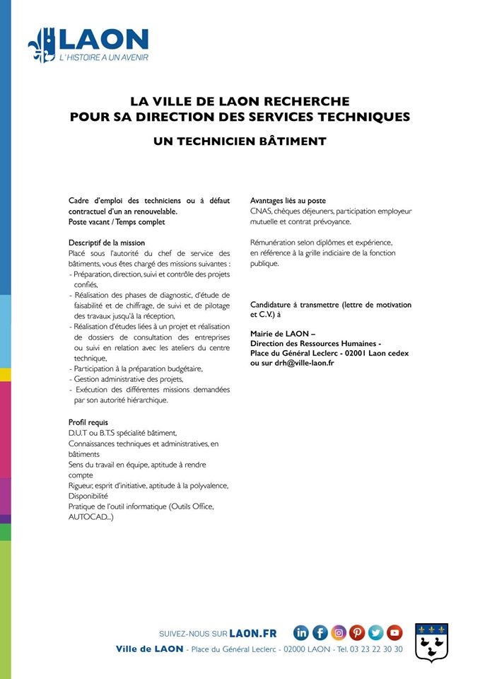 Pour postuler, adressez votre lettre de motivation et votre C.V. à : Mairie de LAON – Direction des Ressources Humaines - place du Général Leclerc - 02001 Laon cedex