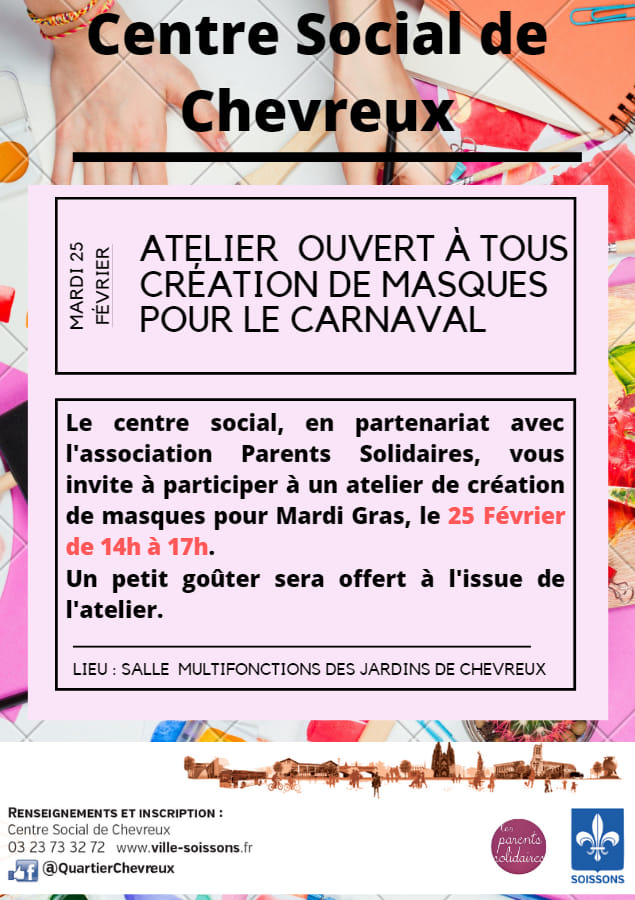 Nous vous proposons un atelier masques de carnaval en partenariat avec Les Parents Solidaires le mardi 25 février de 14h à 17h...