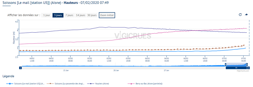En 10 jours à Soissons, le débit est passé de 60m3 / seconde à 210 m3 / seconde ce matin, et à Berry-au-bac de 25 à 265 !
