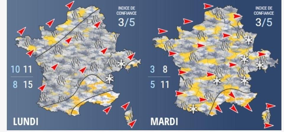 Lundi, des conditions très agitées sont attendues avec le passage d'une perturbation activement pluvieuse, associée à un probable fort coup de vent.