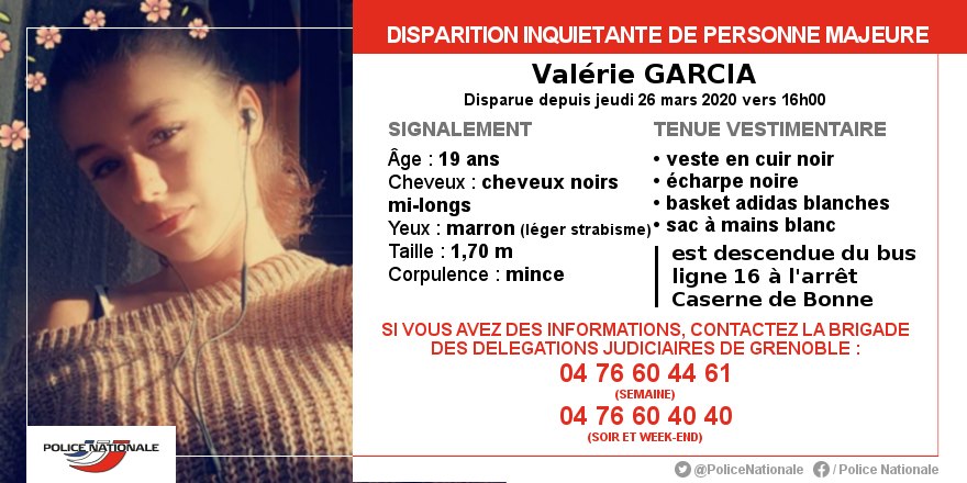 APPEL À TÉMOINS] Disparition inquiétante de Valérie, 19 ans, depuis le 26 mars 2020. Merci de vos partages pour aider les policiers de Grenoble.